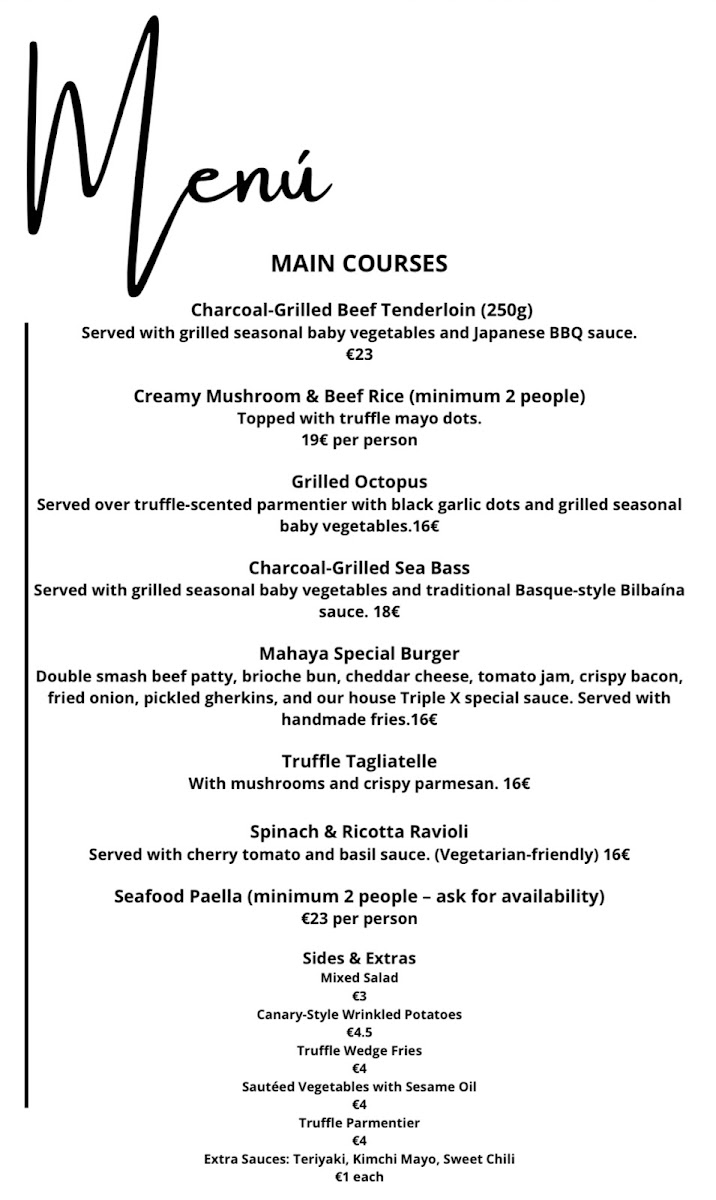 Mahaya Sunset Club Menu
